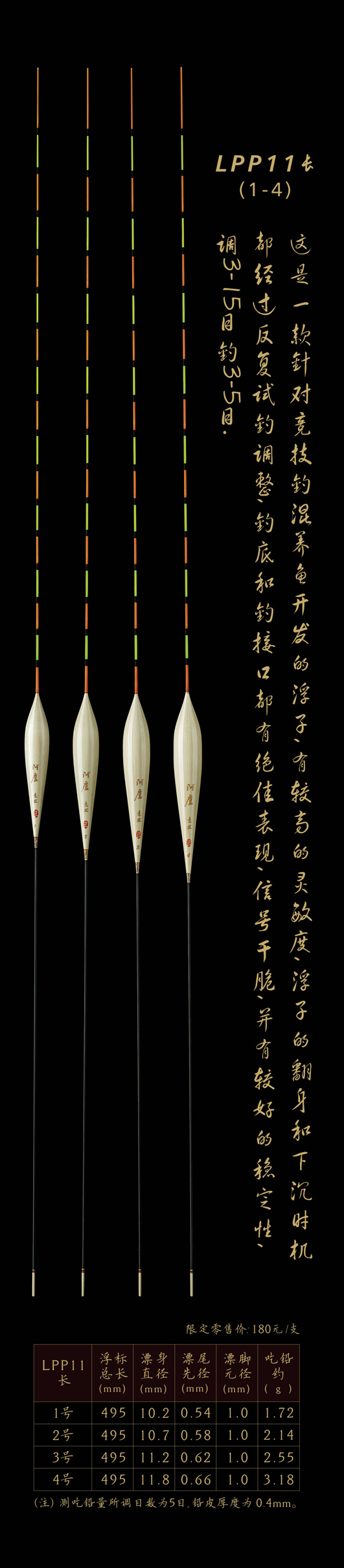 LPP11長(zhǎng):這是一款針對(duì)競(jìng)技釣混養(yǎng)魚(yú)開(kāi)發(fā)的浮子,有較高的靈敏度,浮子的翻身和下沉?xí)r機(jī)都經(jīng)過(guò)反復(fù)試釣調(diào)整,釣底釣接口都有絕佳表現(xiàn),信號(hào)干脆,并有較好的穩(wěn)定性,調(diào)3—15目,釣3—5目。