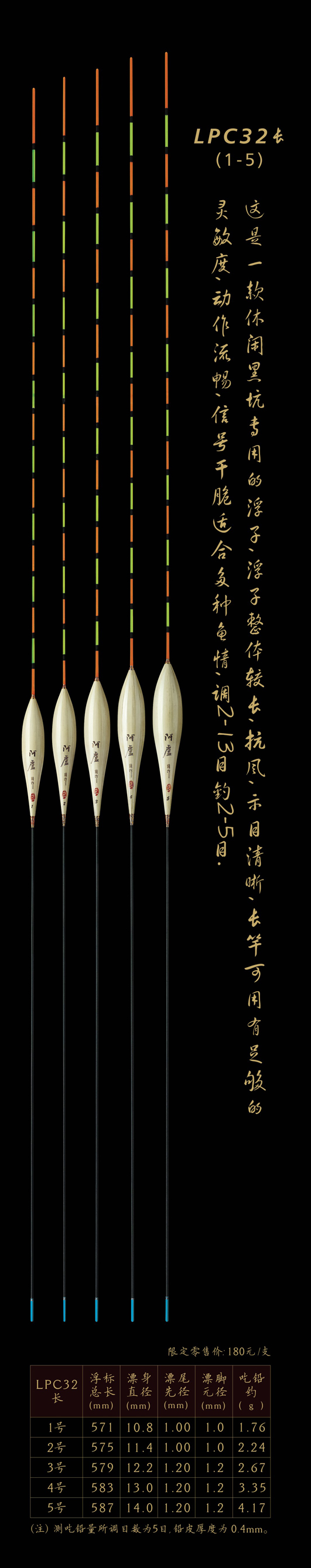 LPC32長(zhǎng):是一款休閑黑坑專用的浮子,浮子整體較長(zhǎng),抗風(fēng),示目清晰,長(zhǎng)竿可用有足夠的靈敏度,動(dòng)作流暢,信號(hào)干脆適合多種魚(yú)情,調(diào)2—13目,釣2-5目。